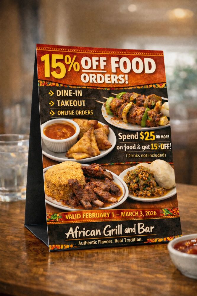USE OUR PROMO CODE aAT CHECK OUT: "Taste of Africa" ends 3/3/26. We are open Monday through Saturday from 12 PM to 9 PM. We are closed on Sundays.