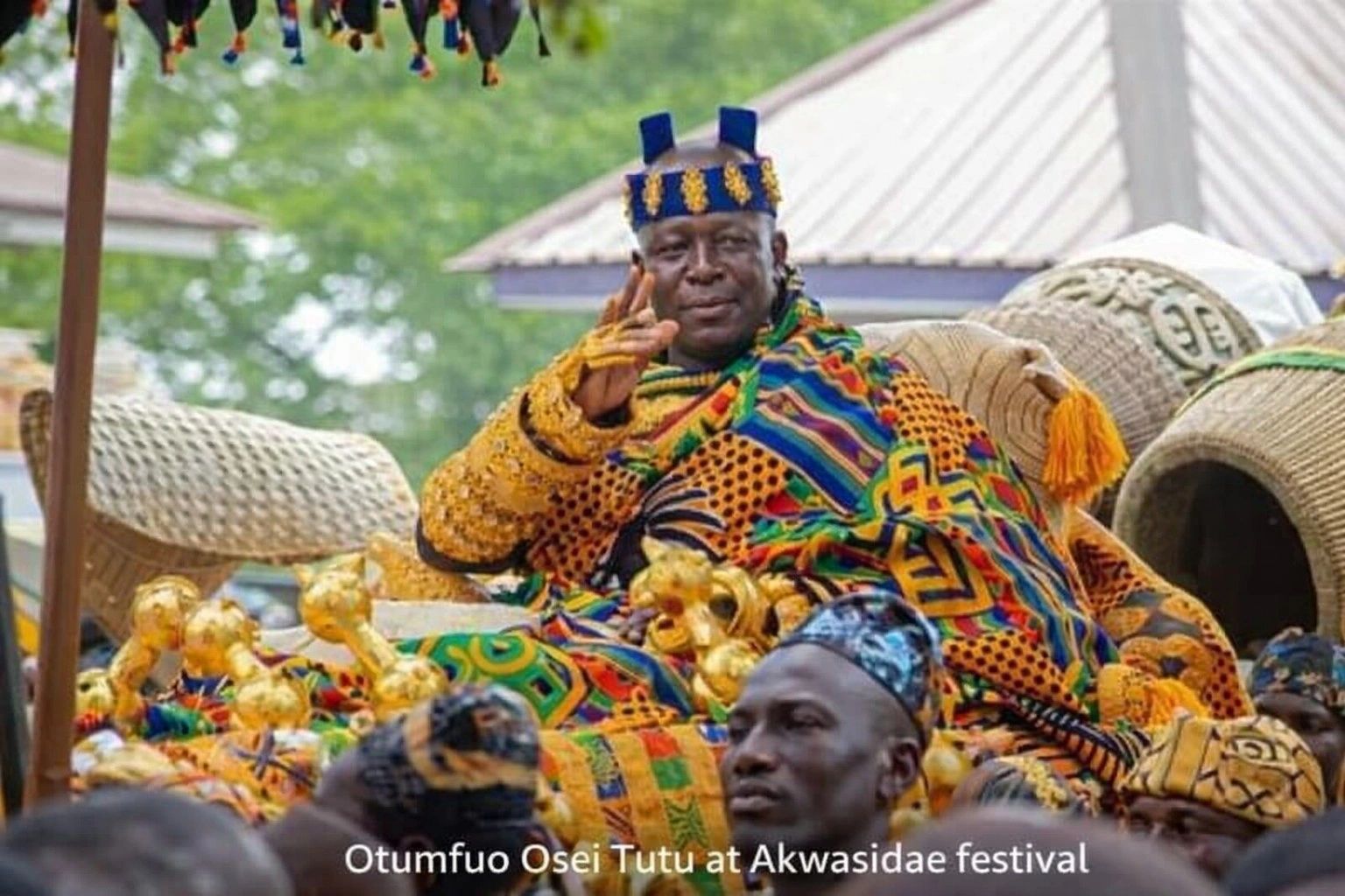 As morning unfolds, the courtyard of Manhyia Palace begins to fill — cloth bright against stone, drums testing the air, the first rhythms calling people into sacred time.